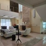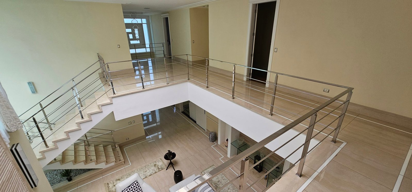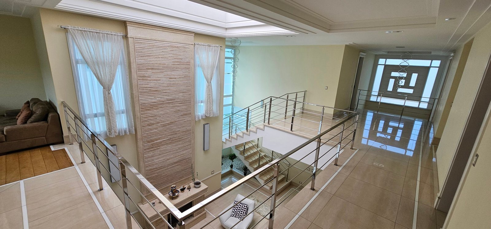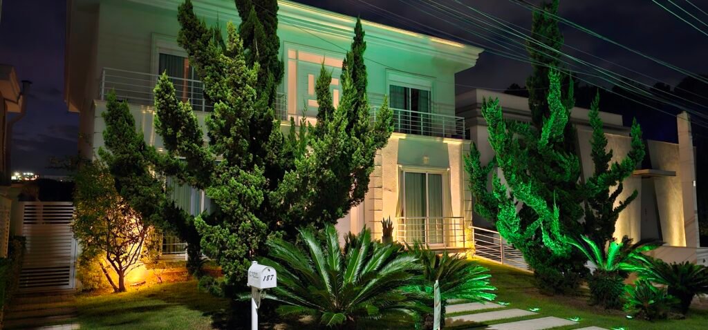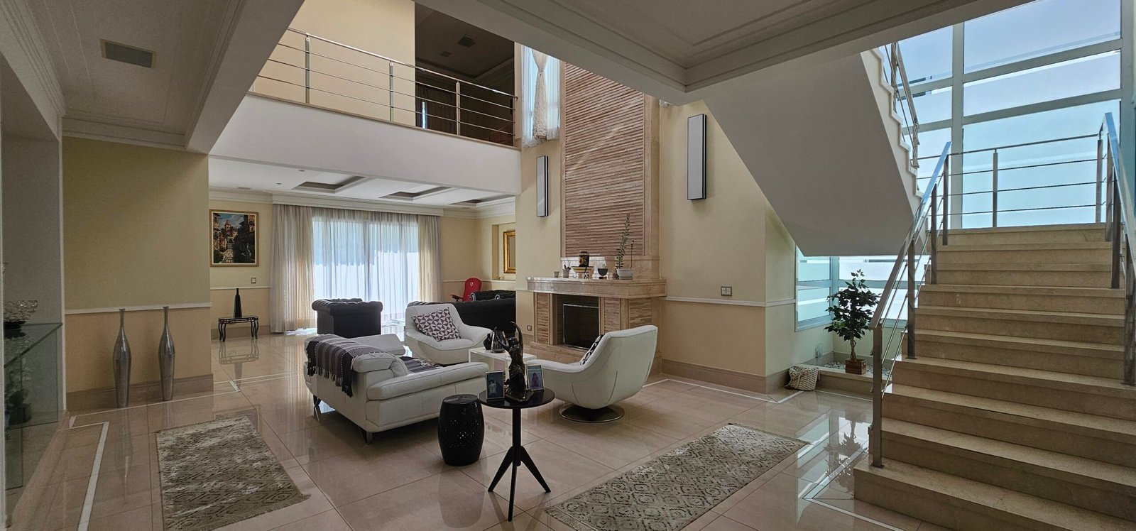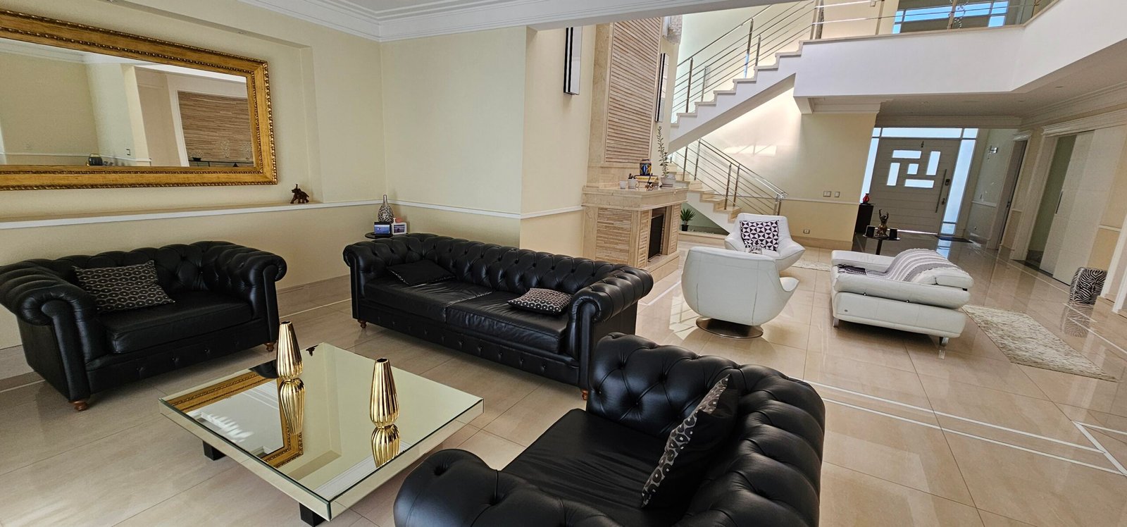 A entrada principal impressiona pelo pé-direito duplo de mais de 8 metros e pela imponente porta de acesso. Logo ao lado, um escritório privativo, lavabo e um Home Teather principal oferecem funcionalidade e conforto.