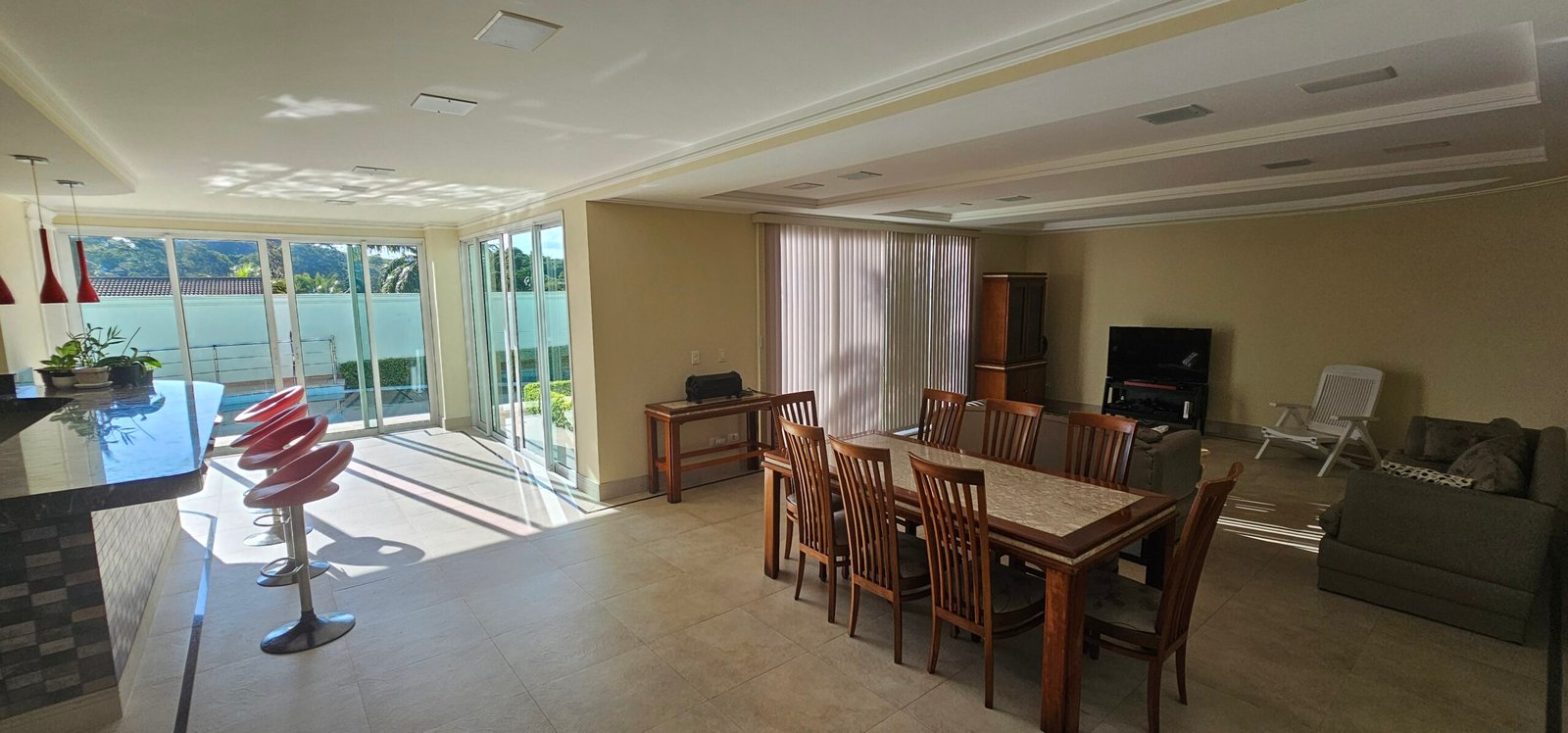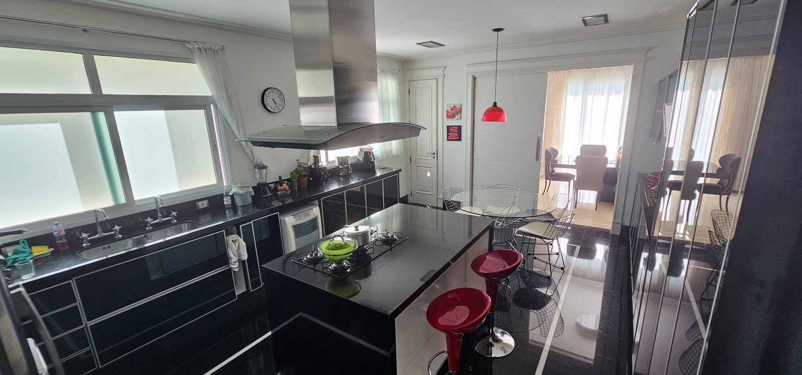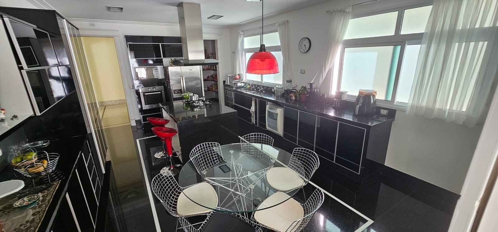 A cozinha gourmet é um dos destaques deste piso, equipada com móveis planejados, bancada de mármore São Gabriel e uma ilha funcional que inclui um fogão de 6 bocas e espaço para refeições.