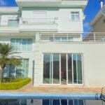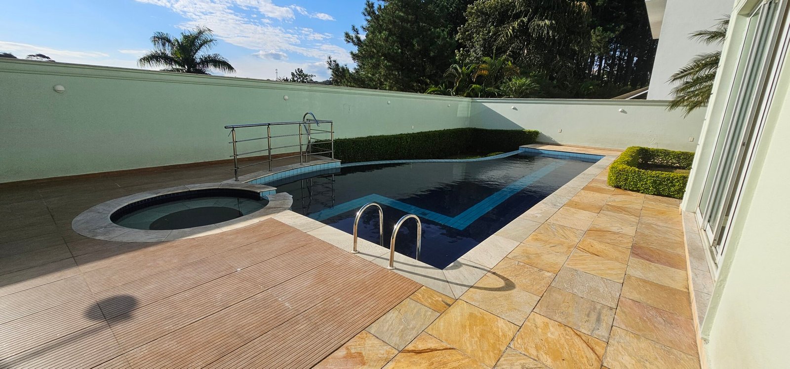 A casa conta com uma piscina de borda infinita com capacidade para 25 mil litros, posicionada para aproveitar ao máximo a luz solar. O espaço ao redor é composto por um deck para banhistas e um jardim harmonioso.