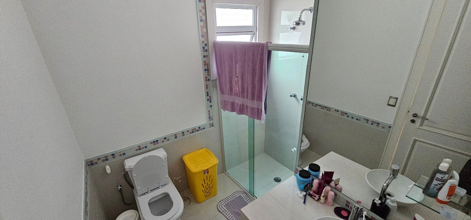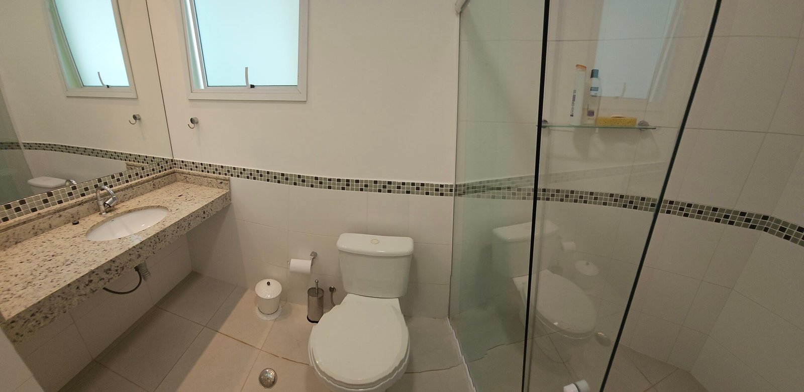 A suíte master se destaca pelo seu espaço generoso, vista panorâmica para o lago e para o recém-inaugurado parque aquático. O banheiro, amplo e elegante, já está preparado para banheira ou hidromassagem.